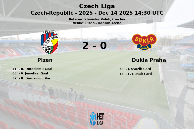 Plzen, República Tcheca – Em uma partida disputada na Doosan Arena, o Plzen venceu o Dukla Praha em um jogo correspondente à 19ª rodada da Liga Tcheca. A equipe da casa dominou a posse de bola com 56% e gerou um maior número de oportunidades de gol, totalizando 21 chutes, dos quais 8 foram no alvo.