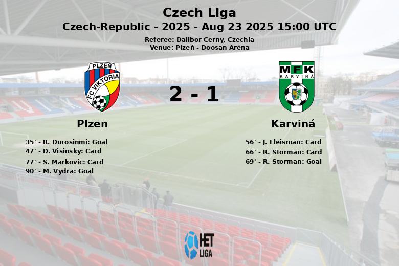 O Plzen abriu o placar aos 35 minutos com um gol de R. Durosinmi, após uma jogada onde não houve assistência. No entanto, o Karviná não desistiu e encontrou o empate aos 69 minutos por meio de R. Storman, assistido por E. Ayaosi. O Plzen conseguiu salvar um ponto no final da partida com um pênalti convertido por M. Vydra aos 90 minutos.