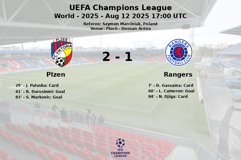 O Plzeň abriu o placar aos 41 minutos com um gol de R. Durosinmi, assistido por A. Memic. No entanto, o Rangers respondeu aos 60 minutos graças a L. Cameron, que aproveitou uma assistência de Danilo Pereira para igualar o placar. O jogo se manteve tenso e disputado até os minutos finais, quando S. Markovic marcou para o Plzen aos 83 minutos com assistência de C. Kabongo, selando o marcador.