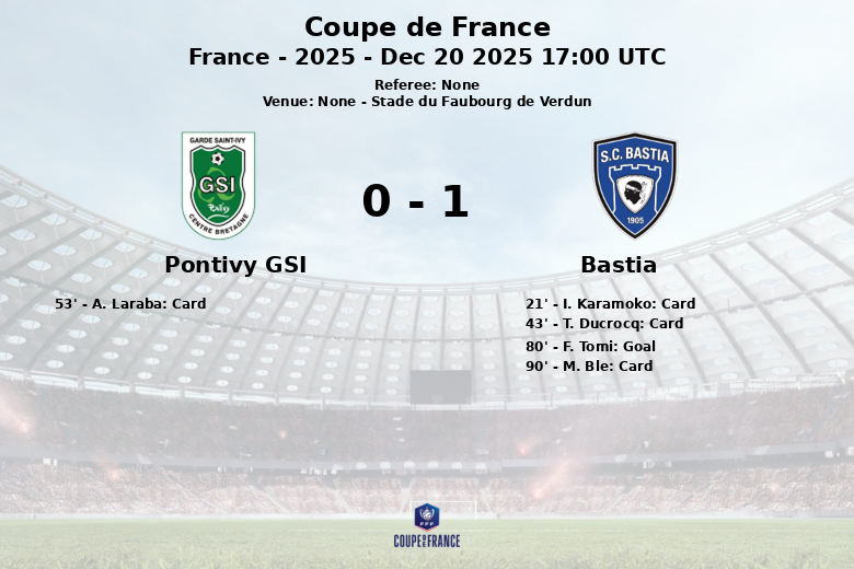 Apesar da disparidade na posse de bola, o Pontivy GSI tentou criar oportunidades, embora tenha conseguido apenas um chute a gol em sete tentativas. O Bastia, por outro lado, demonstrou maior precisão, com 5 chutes a gol de um total de 11. As defesas de ambas as equipes se mostraram resilientes, embora o Bastia tenha recebido dois cartões amarelos (I. Karamoko aos 21 minutos e M. Ble aos 90 minutos) e o Pontivy GSI um (A. Laraba aos 53 minutos). O único gol da partida saiu aos 80 minutos, marcado por F. Tomi, garantindo a vitória para o Bastia.