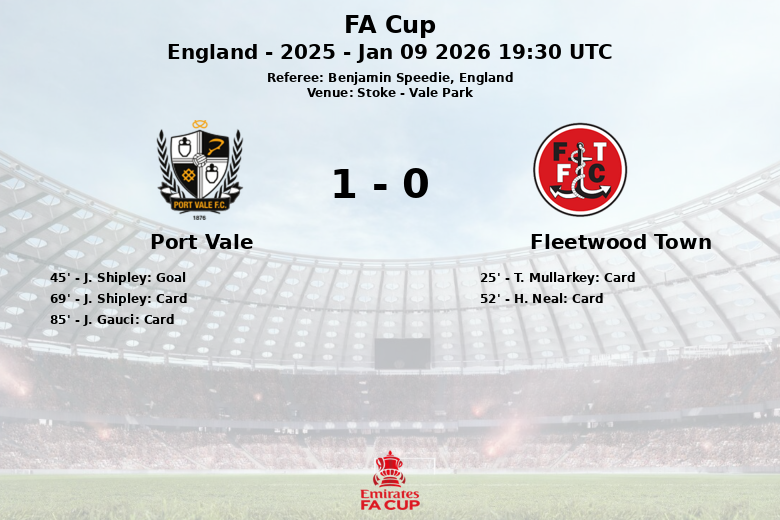 A partida, apitada por Benjamin Speedie, foi caracterizada por seu dinamismo e luta constante no meio-campo. O Port Vale avança assim na FA Cup, enquanto o Fleetwood Town se despede da competição.