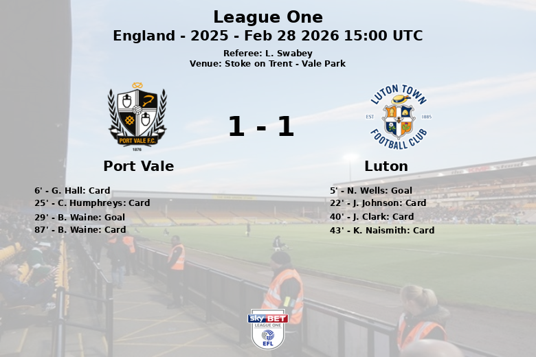 Stoke on Trent, Inglaterra – Em partida válida pela 35ª rodada da League One, Port Vale e Luton Town empataram em um jogo de muita intensidade e cartões. A partida, disputada no Vale Park sob a arbitragem de L. Swabey, terminou com o placar de 1 a 1.