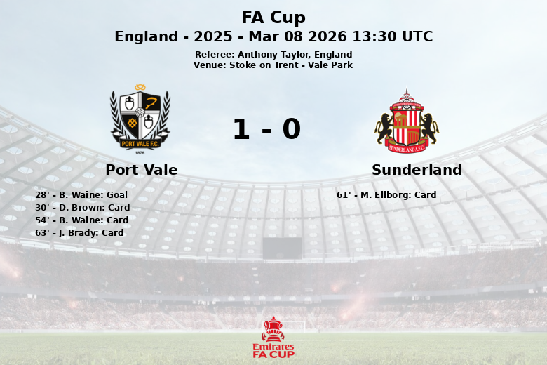 Stoke on Trent testemunhou um confronto tenso na FA Cup, onde o Port Vale lutou contra um Sunderland dominante na posse de bola. Apesar da diferença no controle da bola (31% para Port Vale contra 69% para Sunderland), o time da casa mostrou garra, embora com menos eficácia no ataque. B. Waine abriu o placar para o Port Vale aos 28 minutos com um gol após uma assistência de D. Brown. No entanto, o Sunderland manteve a pressão, gerando mais oportunidades de gol, embora apenas seis de suas dezesseis tentativas tenham conseguido acertar o alvo. A partida foi marcada pela intensidade, refletida nos cartões amarelos recebidos por ambas as equipes: três para o Port Vale (D. Brown, B. Waine, J. Brady) e um para o Sunderland (M. Ellborg). O Port Vale cometeu 11 faltas, enquanto o Sunderland cometeu 9. Os donos da casa conseguiram 5 escanteios, enquanto o Sunderland teve 9. A partida, arbitrada por Anthony Taylor, foi disputada em um ambiente carregado e com um claro domínio do Sunderland na posse de bola.