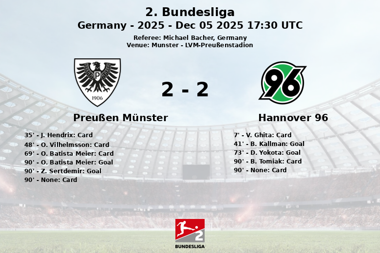 Münster, Alemanha – Em uma partida realizada no LVM-Preußenstadion, o Hannover 96 sucumbiu a uma pressão final feroz do Preußen Münster, que conseguiu empatar a partida com dois gols nos minutos finais. O jogo, correspondente à 15ª rodada da 2. Bundesliga, foi disputado em um ambiente carregado e marcado por um alto número de faltas e cartões amarelos.