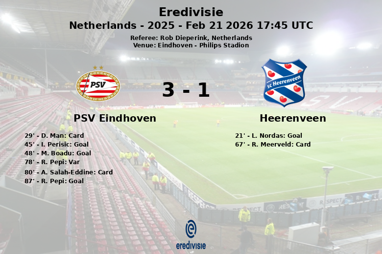 Apesar da derrota, o Heerenveen mostrou um bom nível competitivo, aproveitando suas oportunidades e complicando por momentos o jogo do líder da Eredivisie. O PSV, com uma posse de bola avassaladora e um ataque constante, demonstrou seu poderio ofensivo, embora também tenha evidenciado certas fragilidades defensivas que deverá corrigir para os próximos jogos. A partida foi marcada por dois cartões amarelos para o PSV (D. Man e A. Salah-Eddine) e um para o Heerenveen (R. Meerveld).
