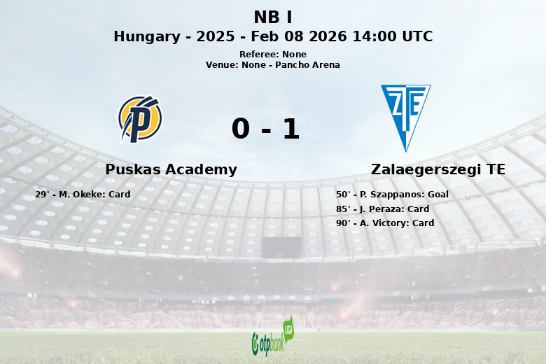 Felcsút, Hungria – Em partida válida pela 21ª rodada da NB I, o Puskas Academy garantiu a vitória no Pancho Arena com o placar final de 1 a 0 contra o Zalaegerszegi TE. O único gol da partida ocorreu aos 50 minutos, resultado de um gol contra de P. Szappanos.