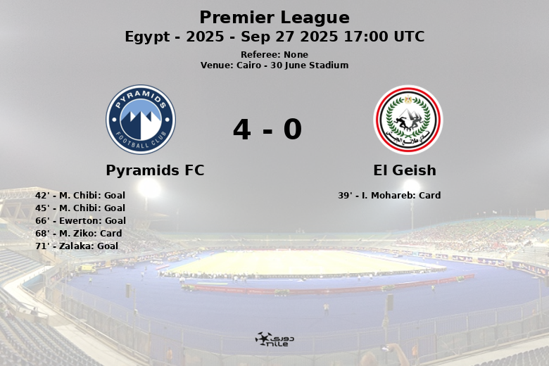 O Pyramids FC dominou a partida disputada no Estádio 30 de Junho, no Cairo, válida pela nona rodada da Premier League Egípcia de 2025, com uma vitória contundente. A equipe da casa impôs seu ritmo com uma posse de bola de 63% e um total de 16 chutes, dos quais 5 foram ao gol. O placar foi aberto aos 42 minutos, graças a M. Chibi, com assistência de I. Toure. O próprio Chibi ampliou a vantagem antes do intervalo, aos 45 minutos, com um segundo gol.