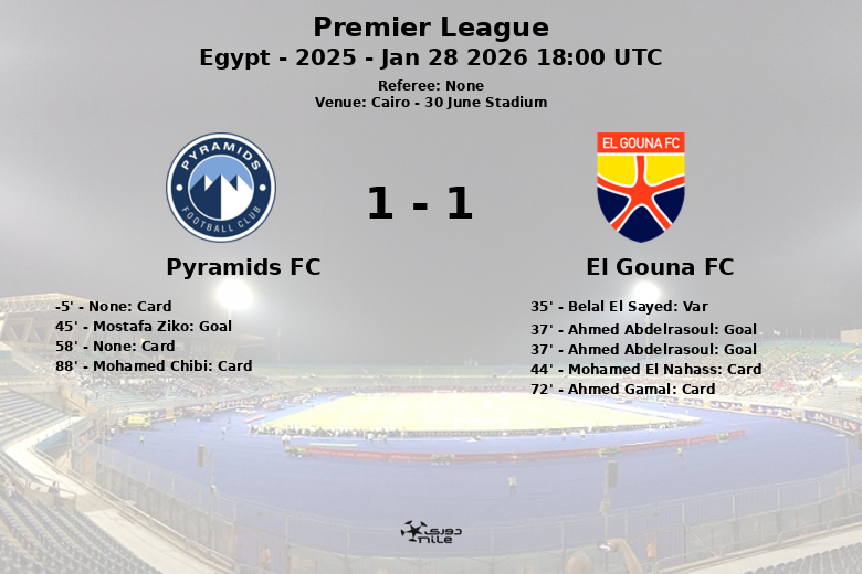 Cairo – Um jogo vibrante e cheio de emoções ocorreu no Estádio 30 de Junho, onde Pyramids FC e El Gouna FC empataram em um confronto da Premier League egípcia. Apesar do domínio esmagador na posse de bola (80% para o Pyramids FC), a partida foi caracterizada por seu equilíbrio no placar.