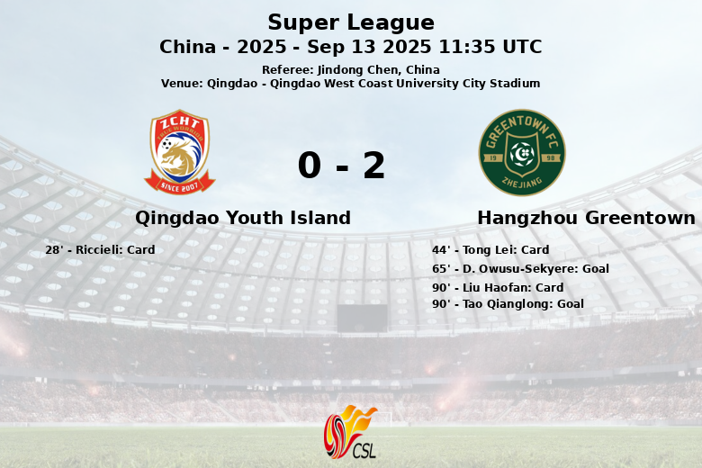 O primeiro gol da partida chegou aos 65 minutos, marcado por D. Owusu-Sekyere, que quebrou o empate inicial. Apesar das tentativas do Qingdao Youth Island de igualar o placar, com 9 chutes totais (3 no alvo), a defesa do Hangzhou Greentown se manteve firme. A disciplina também foi um fator na partida, com Riccieli (Qingdao Youth Island) e Tong Lei e Liu Haofan (Hangzhou Greentown) recebendo cartões amarelos. Nos acréscimos, Tao Qianglong selou a vitória do Hangzhou Greentown com o segundo gol da partida. O Qingdao Youth Island cometeu 12 faltas e teve 1 escanteio, enquanto o Hangzhou Greentown cometeu 11 faltas e teve 4 escanteios.