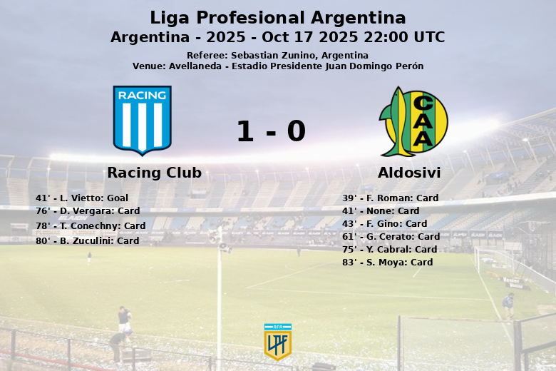 Avellaneda, Argentina – Em uma partida realizada no Estádio Presidente Juan Domingo Perón, o Racing Club venceu o Aldosivi na 13ª rodada da Liga Profesional Argentina. O jogo, apitado por Sebastián Zunino, foi caracterizado por um domínio avassalador da posse de bola pelo Racing Club, atingindo 68%, contra 32% do Aldosivi.