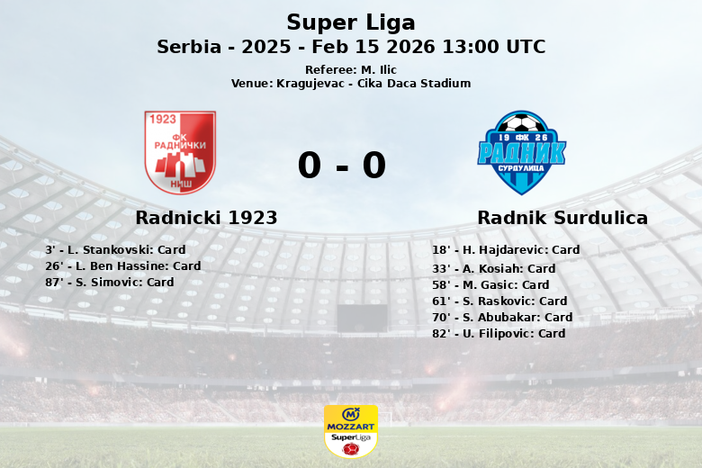 Kragujevac, Sérvia – Em uma partida disputada no Cika Daca Stadium, arbitrada por M. Ilic, o Radnicki 1923 e o Radnik Surdulica empataram em 0-0. O jogo foi marcado pela intensidade e pelo alto número de cartões. O Radnicki 1923 dominou a posse de bola com 65%, tentando abrir o placar com 9 chutes, dos quais apenas 2 foram no alvo. Apesar do seu domínio territorial, não conseguiram concretizar as suas oportunidades. Por sua vez, o Radnik Surdulica, com 35% de posse, buscou o gol com 11 chutes, embora nenhum tenha encontrado o alvo. O encontro foi repleto de faltas, com 12 cometidas pelo Radnicki 1923 e 24 pelo Radnik Surdulica, o que se traduziu em uma chuva de cartões amarelos (2 para o Radnicki e 6 para o Radnik). A tensão culminou com a expulsão de um jogador do Radnicki 1923 nos minutos finais, complicando ainda mais as suas aspirações de vitória. No final, o marcador não se alterou, deixando um ponto para cada equipe nesta jornada da Super Liga Sérvia.