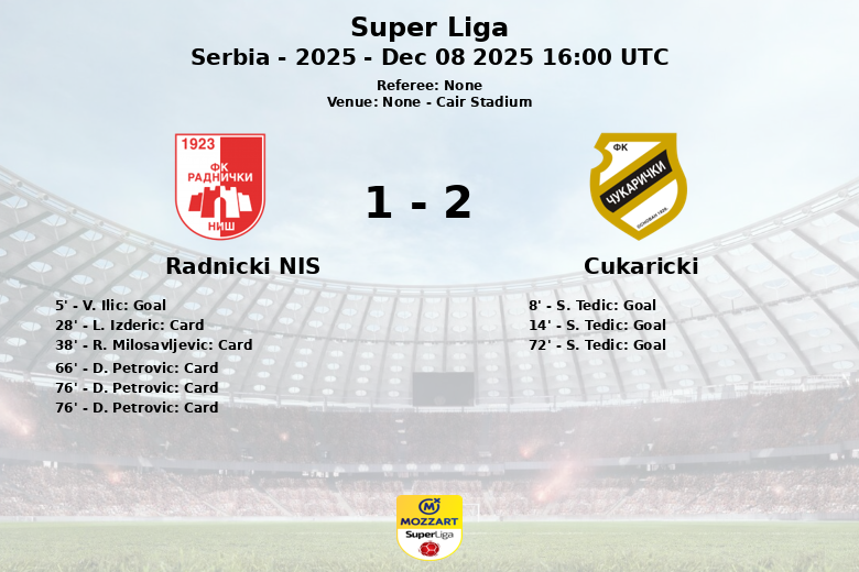Em partida válida pela 18ª rodada da Super Liga Sérvia, o Cukaricki venceu o Radnicki Nis no Cair Stadium. O jogo, disputado em um ambiente intenso, culminou em um placar favorável à equipe visitante.