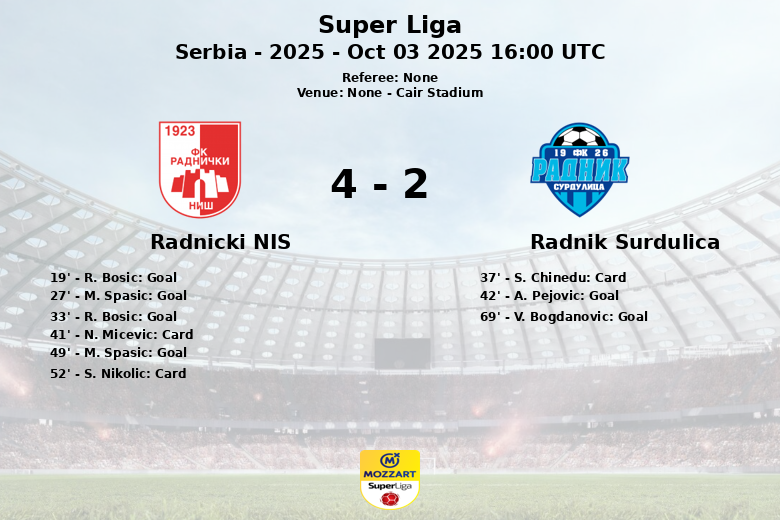 Niš, Sérvia – O Radnicki NIS prevaleceu sobre o Radnik Surdulica em uma partida da Super Liga Sérvia realizada no Estádio Cair que não deixou ninguém indiferente. A partida, pertencente à 11ª rodada da temporada regular, terminou com uma retumbante vitória em casa.