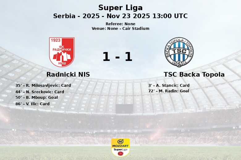 Niš, Sérvia – Em um jogo vibrante disputado no Estádio Cair, Radnički Niš e TSC Backa Topola empataram em um gol cada, em partida válida pela 16ª rodada da Super Liga Sérvia. O jogo, caracterizado por alta intensidade e luta no meio-campo, viu o Radnički sair na frente aos 50 minutos com um gol de B. Mboup após assistência de R. Bosic.