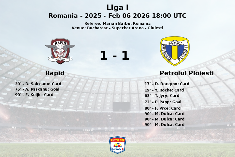 A partida foi caracterizada por um claro domínio na posse de bola por parte do Rapid (70%), que gerou um total de 18 chutes, dos quais 5 foram no alvo. O Petrolul Ploiesti, por sua vez, recuou e buscou o contra-ataque, gerando 6 chutes no total. A disciplina defensiva do Petrolul foi comprometida com 18 faltas cometidas e uma série de advertências, incluindo a expulsão de M. Dulca nos minutos finais. O Rapid cometeu 13 faltas e recebeu uma advertência. O encontro terminou com um empate que deixou um sabor amargo para ambas as equipes.