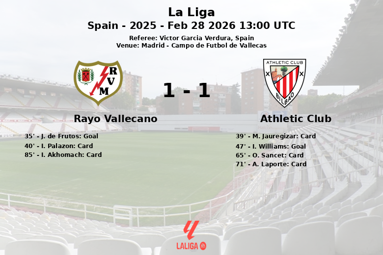 Madrid – Num jogo disputado no Campo de Futbol de Vallecas, Rayo Vallecano e Athletic Club empataram, numa partida marcada pela intensidade e pelos cartões. O jogo, correspondente à 26ª jornada de La Liga, Temporada 2025, terminou com um resultado que reflete a paridade no jogo.
