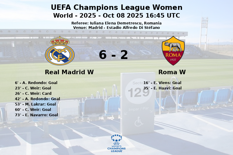 Madrid testemunhou uma exibição ofensiva do Real Madrid Feminino, que superou de forma contundente a Roma em uma partida disputada no Estádio Alfredo Di Stéfano. O encontro, correspondente à fase de grupos da UEFA Champions League Feminina, finalizou com um placar elástico, reflexo do domínio local.