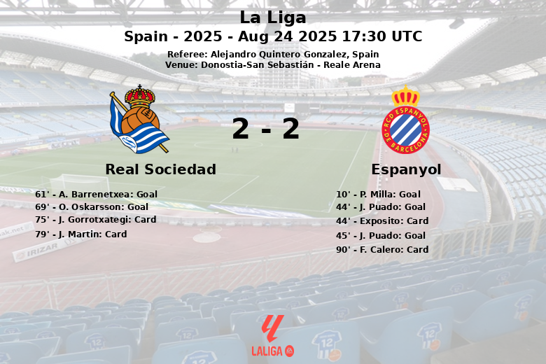 No entanto, a Real Sociedad não desistiu e voltou com energia renovada no segundo tempo. A. Barrenetxea diminuiu a desvantagem aos 61 minutos, e O. Oskarsson empatou o jogo aos 69 minutos, assistido por M. Oyarzabal.