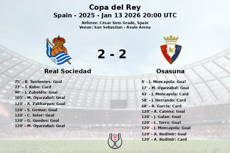 Na prorrogação, o cansaço e a tensão se tornaram evidentes. M. Oyarzabal perdeu um pênalti crucial para o Real Sociedad aos 105 minutos. A decisão foi para os pênaltis, onde a emoção continuou até o fim. Após uma longa série de cobranças, com erros dos dois lados, o Real Sociedad finalmente prevaleceu nas penalidades. O jogo, arbitrado por César Soto Grado, será lembrado por sua intensidade e dramatismo. Apesar da posse de bola e dos chutes a gol do Real Sociedad, a eficácia inicial do Osasuna quase garantiu a sua passagem para a próxima fase.