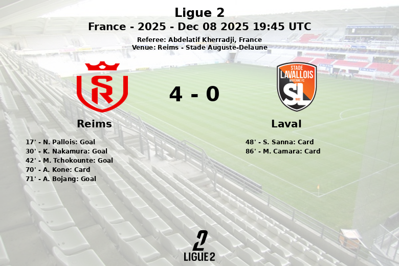 No segundo tempo, o Reims não diminuiu o ritmo. Apesar de um cartão amarelo para A. Kone aos 70 minutos, a equipe da casa selou sua vitória com um gol de A. Bojang aos 71 minutos. O Laval, embora tenha tentado reagir, foi limitado pela forte defesa do Reims e pela falta de precisão em seus chutes, não conseguindo nenhum chute a gol. A partida culminou em uma vitória esmagadora para o Reims, que provou ser o claro dominador do jogo.