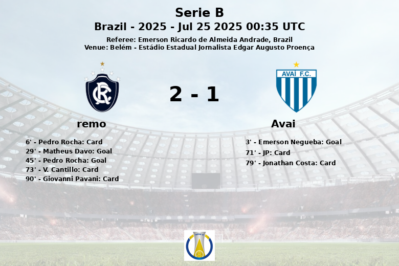 A partida começou com um gol logo aos 3 minutos de Emerson Negueba para o Avaí. No entanto, o Remo reagiu e Matheus Davo empatou a partida aos 29 minutos. Antes do intervalo, Pedro Rocha converteu um pênalti crucial aos 45 minutos, dando a vantagem ao Remo. No segundo tempo, o placar não se alterou, selando a vitória para a equipe da casa.