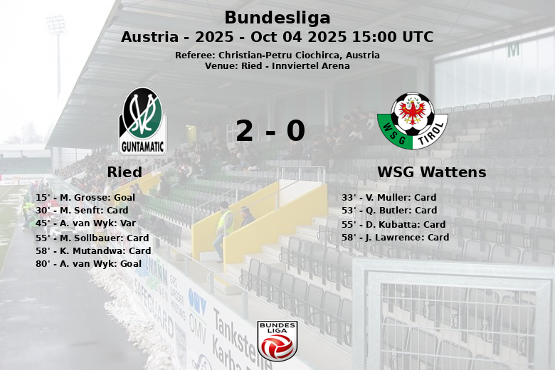 Ried, Áustria – O Ried garantiu uma vitória em casa contra o WSG Wattens em uma partida da Bundesliga marcada pela intensidade e disciplina. Um pênalti convertido por M. Grosse aos 15 minutos deu a vantagem inicial ao Ried, embora o jogo tenha sido interrompido por vários cartões amarelos, com um total de seis mostrados a jogadores de ambas as equipes durante a partida. O primeiro tempo também teve sua dose de drama com um gol anulado para A. van Wyk por impedimento pouco antes do intervalo. No segundo tempo, o Ried ampliou a vantagem aos 80 minutos com um gol de A. van Wyk, selando a vitória para a equipe da casa. Apesar de uma posse de bola ligeiramente superior (52%), o Ried aproveitou melhor suas oportunidades, efetuando um total de 19 remates contra 4 do WSG Wattens. A disciplina foi um fator chave, com o WSG Wattens cometendo mais faltas (16) do que o Ried (13).