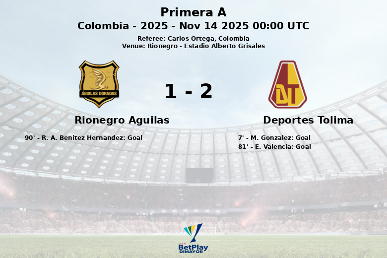 Rionegro, Colômbia – Em uma partida disputada no Estádio Alberto Grisales, o Deportes Tolima superou o Rionegro Aguilas com um placar final de 2 a 1, correspondente à rodada Clausura – 20 da Primera A colombiana. O jogo, arbitrado por Carlos Ortega, foi caracterizado pelo domínio da bola pelo Tolima, que atingiu 61% de posse de bola, contra 39% do Águilas.