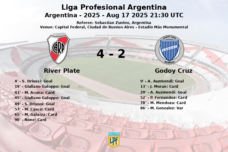 River Plate vs Godoy Cruz Aug 17 2025 21:30 UTC