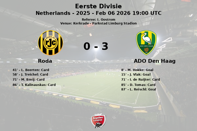 Kerkrade, Países Baixos – O ADO Den Haag garantiu uma vitória retumbante na sua visita ao Parkstad Limburg Stadion, derrotando o Roda num jogo correspondente à 26ª jornada da Eerste Divisie. O jogo, arbitrado por I. Oostrom, viu o ADO Den Haag impor o seu jogo desde o início.