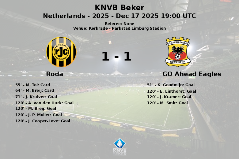 O clímax da partida chegou nos acréscimos. Aos 120 minutos, A. van den Hurk marcou um pênalti para o Roda, mas E. Linthorst igualou imediatamente para o GO Ahead Eagles, também de pênalti. A subsequente disputa de pênaltis foi uma montanha-russa de emoções, onde o GO Ahead Eagles acabou saindo vitorioso após os erros de M. Breij, J. P. Muller e J. Cooper-Love pelo Roda, e os acertos de J. Kramer e M. Smit pelos visitantes.