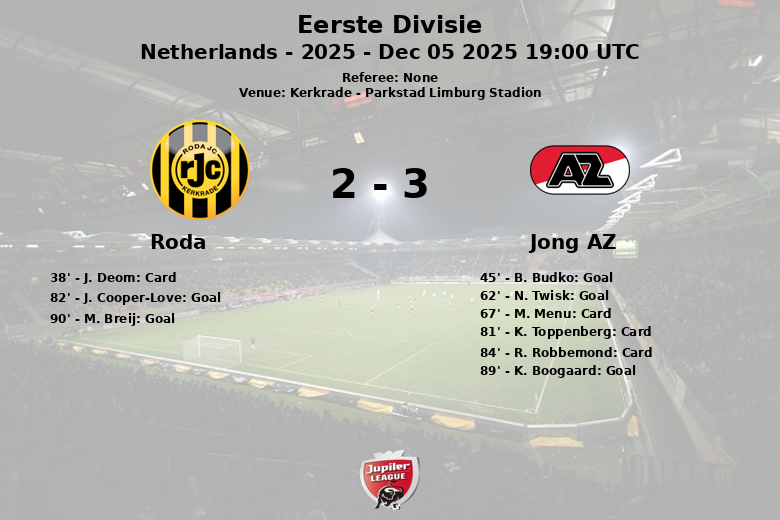 Aos 82 minutos, J. Cooper-Love marcou para o time da casa, dando esperança aos torcedores. No entanto, K. Boogaard marcou novamente para o Jong AZ aos 89 minutos, aparentemente selando o destino do jogo. Mas o Roda não desistiu, e aos 90 minutos, M. Breij marcou um gol dramático que garantiu o empate.