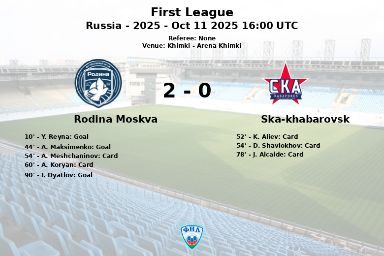 Khimki testemunhou uma partida dominada pelo Rodina Moscou, que prevaleceu sobre o SKA-Khabarovsk com uma atuação sólida em ambas as áreas. O jogo, correspondente à 14ª rodada da First League russa, viu o Rodina assumir a liderança cedo, graças a um gol de Y. Reyna aos 10 minutos. Apesar de perder um pênalti que mais tarde terminou em gol de A. Maksimenko aos 44 minutos, a equipe da casa manteve a pressão.