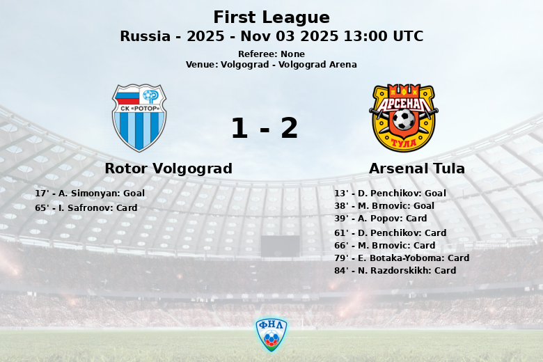 Volgogrado, Rússia – Em uma partida disputada correspondente à 17ª rodada da First League russa, o Arsenal Tula conquistou a vitória contra o Rotor Volgograd na Volgograd Arena. O jogo, disputado em 3 de novembro de 2025, foi marcado pela intensidade e um alto número de advertências.