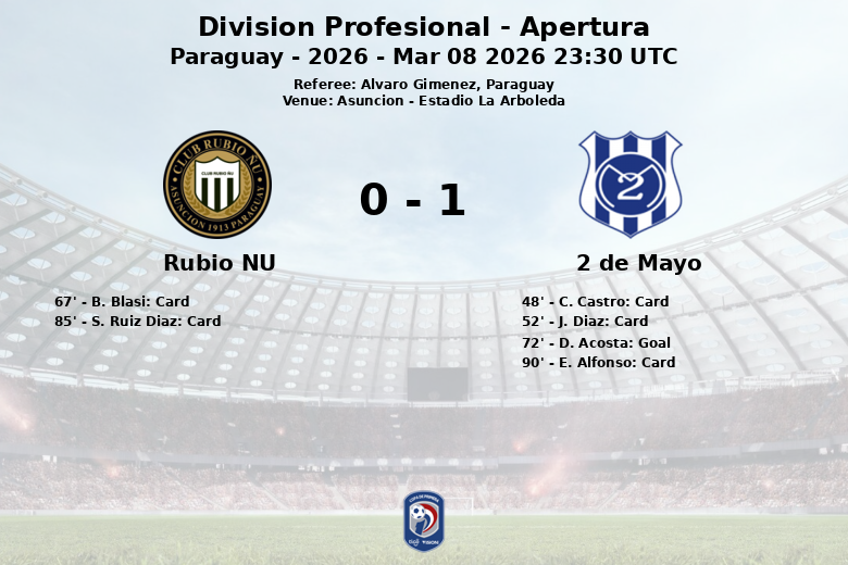 Assunção, Paraguai – Em uma partida cheia de tensão e emoção, o 2 de Mayo garantiu a vitória contra o Rubio Ñu no Estádio La Arboleda em um jogo correspondente à nona jornada do Apertura da Divisão Profissional. A partida, disputada sob o olhar atento do árbitro Alvaro Gimenez, foi decidida no segundo tempo com um gol de D. Acosta aos 72 minutos, com assistência de A. Farina.