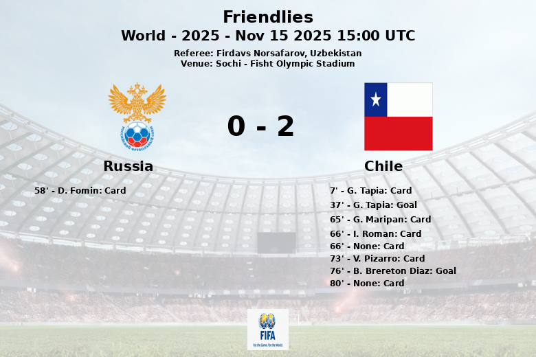 Sochi, Rússia – Em um amistoso realizado no Estádio Olímpico Fisht, o Chile venceu a Rússia em uma partida marcada por intensidade e cartões amarelos. A partida, apitada por Firdavs Norsafarov do Uzbequistão, ocorreu em 15 de novembro de 2025, como parte dos amistosos internacionais.