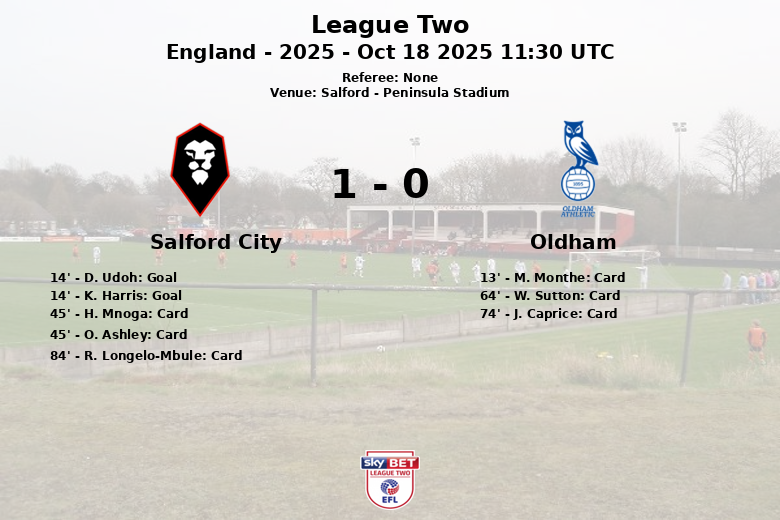 Salford, Inglaterra – Salford City derrotou o Oldham em uma partida disputada no Peninsula Stadium, válida pela 13ª rodada da League Two. O jogo, que terminou com o placar de 1 a 0, foi marcado por intensidade e inúmeros incidentes.