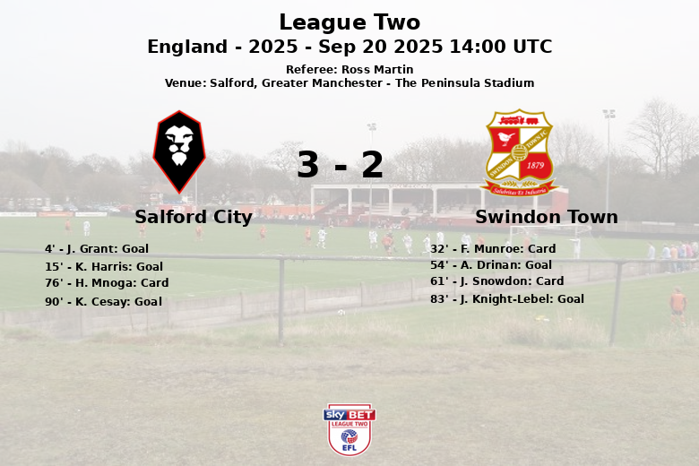 O Salford City começou a partida com força, marcando dois gols logo no início. J. Grant abriu o placar aos 4 minutos, com assistência de D. Udoh, seguido por K. Harris aos 15 minutos, também assistido por Udoh. O Swindon Town reagiu no segundo tempo, com A. Drinan marcando aos 54 minutos, graças a uma assistência de F. Munroe, que havia recebido um cartão amarelo no primeiro tempo. A esperança de um empate se materializou aos 83 minutos com um gol de J. Knight-Lebel.