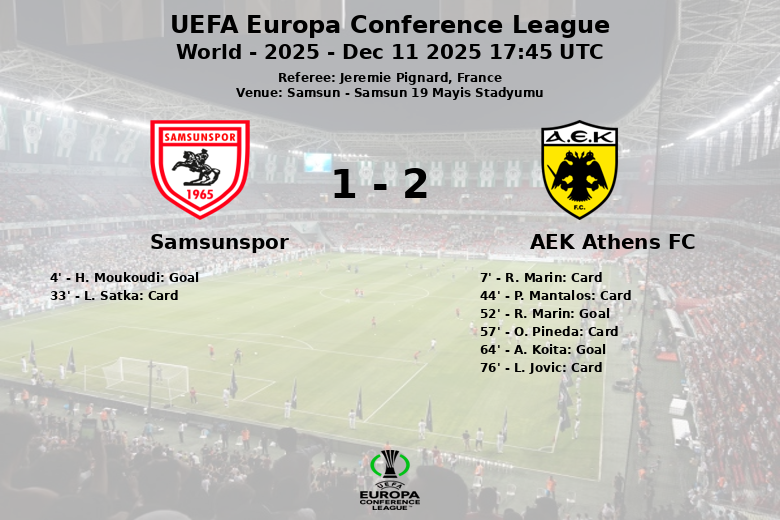 Samsun, 11 de dezembro de 2025 – O AEK Atenas derrotou o Samsunspor no Samsun 19 Mayis Stadyumu num jogo da UEFA Europa Conference League que terminou com um placar de 1-2. A partida, arbitrada pelo francês Jeremie Pignard, foi marcada por um autogolo inicial de H. Moukoudi aos 4 minutos, colocando o Samsunspor em vantagem. No entanto, o AEK Atenas respondeu na segunda metade. R. Marin empatou a partida aos 52 minutos, e A. Koita garantiu a vitória aos 64 minutos, assistido por L. Rota.