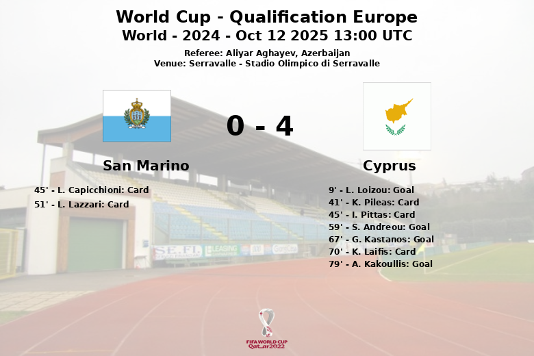 Serravalle, 12 de Outubro de 2025 – O Chipre derrotou de forma convincente San Marino no Stadio Olimpico di Serravalle em um jogo correspondente à fase de grupos da qualificação para a Copa do Mundo. A partida, arbitrada por Aliyar Aghayev do Azerbaijão, refletiu a disparidade entre as duas equipes.