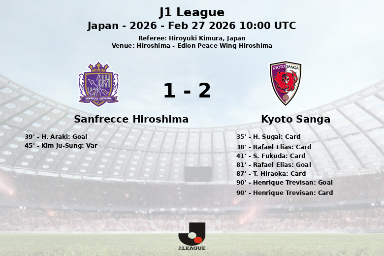 Num emocionante confronto disputado no Edion Peace Wing Hiroshima, o Kyoto Sanga conquistou uma vitória surpreendente sobre o Sanfrecce Hiroshima, jogando em casa. Apesar do Sanfrecce ter dominado a posse de bola com 46%, o Kyoto Sanga impôs seu jogo e aproveitou suas oportunidades, alcançando 54% de posse. A partida foi marcada por um alto número de faltas, 16 para o Kyoto Sanga e 12 para o Sanfrecce Hiroshima.