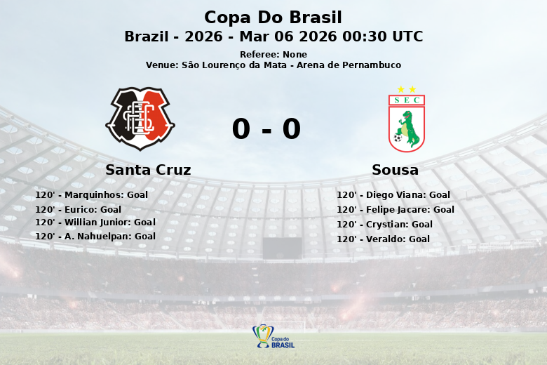A partida, que aconteceu em 6 de março de 2026, será lembrada pela intensidade da disputa de pênaltis, deixando os torcedores à beira de seus assentos até o último momento. Sousa avança para a próxima fase da Copa Do Brasil, deixando o Santa Cruz com o amargor da derrota. Sousa recebeu 3 cartões amarelos e 0 cartões vermelhos, e o Santa Cruz 0 cartões amarelos e 0 cartões vermelhos.