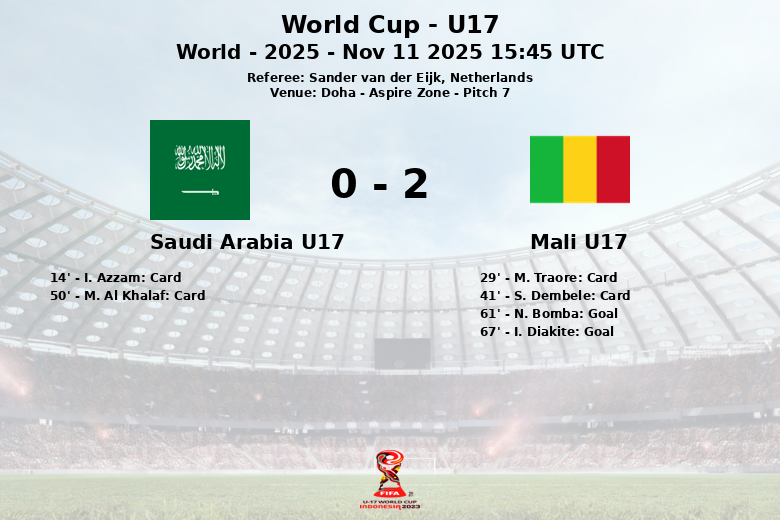 Doha, Catar – Em um jogo disputado no Aspire Zone – Pitch 7, o Mali Sub-17 venceu a Arábia Saudita Sub-17 por 2 a 0. A partida, válida pela fase de grupos do Mundial Sub-17, foi marcada por um jogo físico, refletido nos múltiplos cartões amarelos mostrados pelo árbitro Sander van der Eijk.