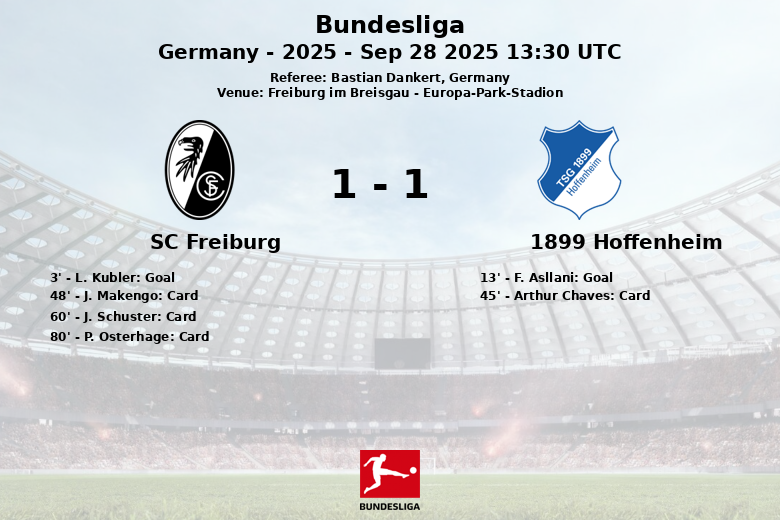 Freiburg im Breisgau, Alemanha – Em um confronto vibrante realizado no Europa-Park-Stadion, o SC Freiburg e o 1899 Hoffenheim empataram em um jogo cheio de emoção e cartões. O Freiburg abriu o placar cedo, graças a um gol de L. Kubler aos 3 minutos, com assistência de J. Adamu. No entanto, o Hoffenheim respondeu rapidamente com um gol de F. Asllani aos 13 minutos, assistido por V. Coufal, igualando o placar.