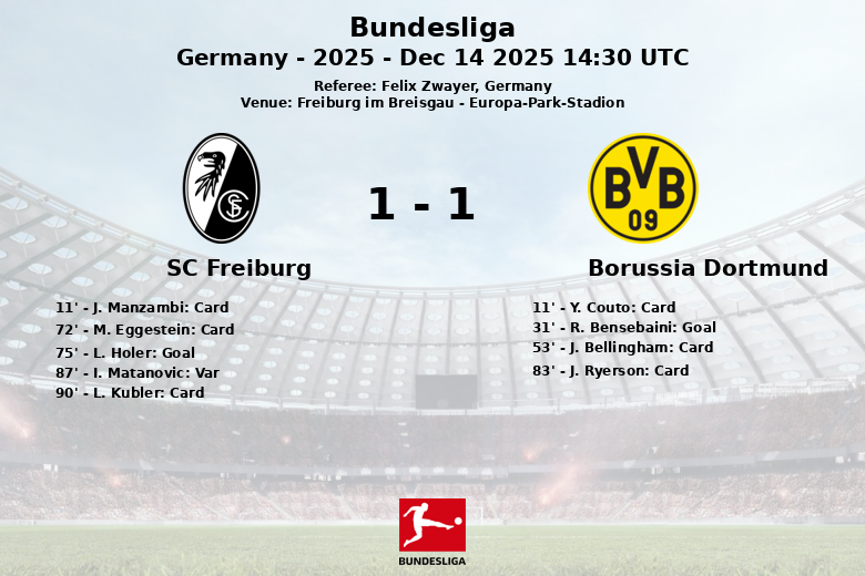 Freiburg im Breisgau, 14 de dezembro de 2025 – Em um confronto tenso e disputado no Europa-Park-Stadion, o Borussia Dortmund e o SC Freiburg empataram em 1 a 1 na 14ª rodada da Bundesliga. A partida, arbitrada por Felix Zwayer, foi marcada pela intensidade e polêmica.