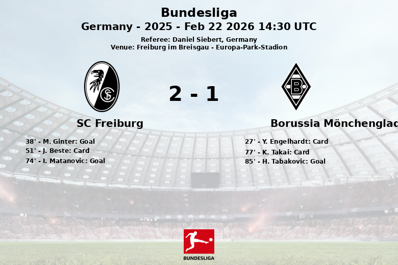 No segundo tempo, I. Matanovic ampliou a vantagem para o SC Freiburg aos 74 minutos. K. Takai do Borussia Mönchengladbach também recebeu um cartão amarelo aos 77 minutos. O Borussia Mönchengladbach respondeu tardiamente com um gol de H. Tabakovic aos 85 minutos, assistido por K. Stoger, mas não foi suficiente para mudar o resultado.