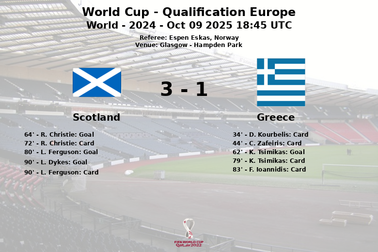 Glasgow, Escócia – Em um jogo cheio de intensidade e emoção, a Escócia conseguiu uma virada impressionante para vencer a Grécia no Hampden Park, em uma partida válida pela fase de grupos da Qualificação Europeia para a Copa do Mundo. A partida, arbitrada por Espen Eskas, da Noruega, foi disputada em um ambiente eletrizante, com uma torcida escocesa que não parou de apoiar sua equipe.