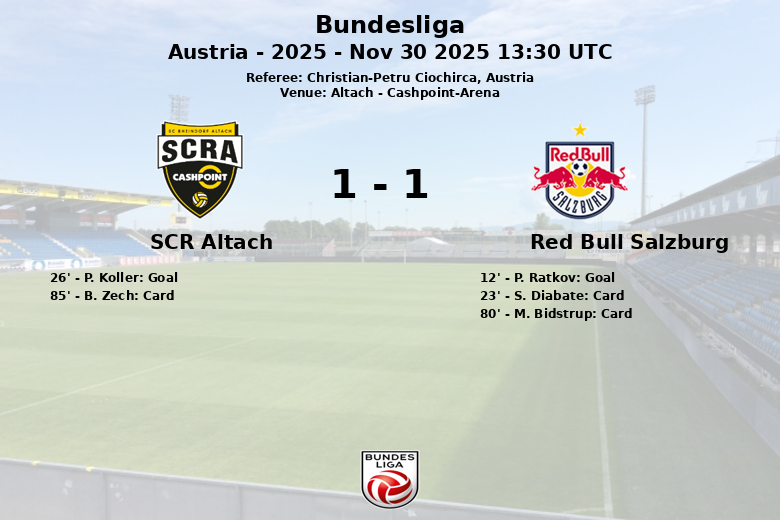 Altach, Áustria – Em uma partida disputada sob o olhar atento do árbitro Christian-Petru Ciochirca, SCR Altach e Red Bull Salzburg empataram em um jogo correspondente à 15ª rodada da Bundesliga Austríaca 2025. A partida, jogada na Cashpoint-Arena, foi um reflexo da intensidade da liga, com ambas as equipes lutando por cada bola.