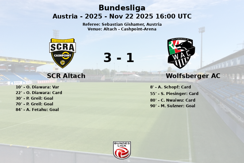 Altach, Áustria – O SCR Altach venceu em casa o Wolfsberger AC em uma partida disputada na Cashpoint-Arena. Apesar de uma posse de bola maioritariamente favorável ao Wolfsberger AC (62% contra 38%), o Altach demonstrou maior eficácia na frente do gol. A partida teve momentos de tensão, refletidos nos quatro cartões amarelos mostrados durante o jogo, um para o Altach e três para o Wolfsberger AC.