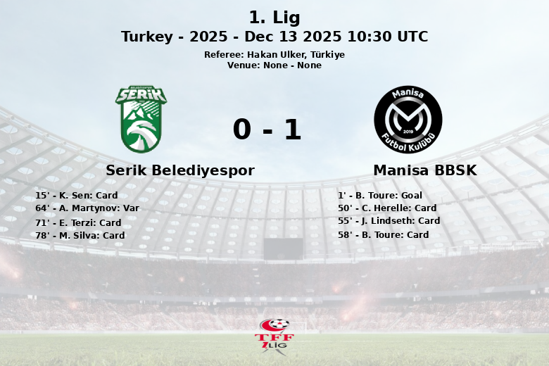 Em uma partida marcada pela intensidade e várias advertências, o Manisa BBSK conseguiu superar o Serik Belediyespor. O jogo, correspondente à 17ª rodada da 1. Lig turca e arbitrado por Hakan Ulker, começou com um gol rápido de B. Toure no 1º minuto, dando a vantagem inicial ao Manisa BBSK.