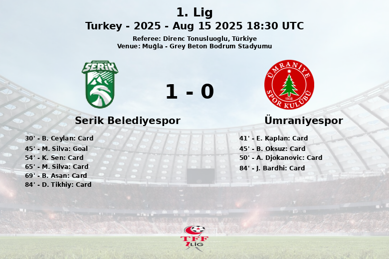Muğla, Turquia – Em uma partida disputada no Grey Beton Bodrum Stadyumu, o Serik Belediyespor conquistou uma valiosa vitória sobre o Ümraniyespor com um placar de 1-0. O jogo, correspondente à segunda rodada da temporada regular da 1. Lig, foi marcado por tensão e disciplina, com um total de nove cartões amarelos mostrados pelo árbitro Direnc Tonusluoglu.